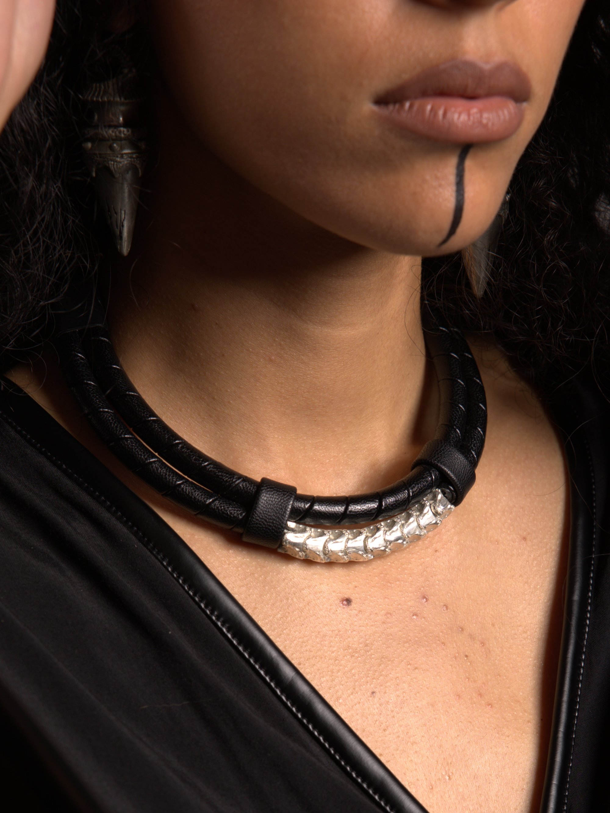 A sleek, high-impact choker designed to stand out. Made from smooth vegan leather, this double-layer piece frames the neck with attitude. At the front, a row of snake vertebrae cast in brass and plated with sterling silver adds a striking metallic edge.